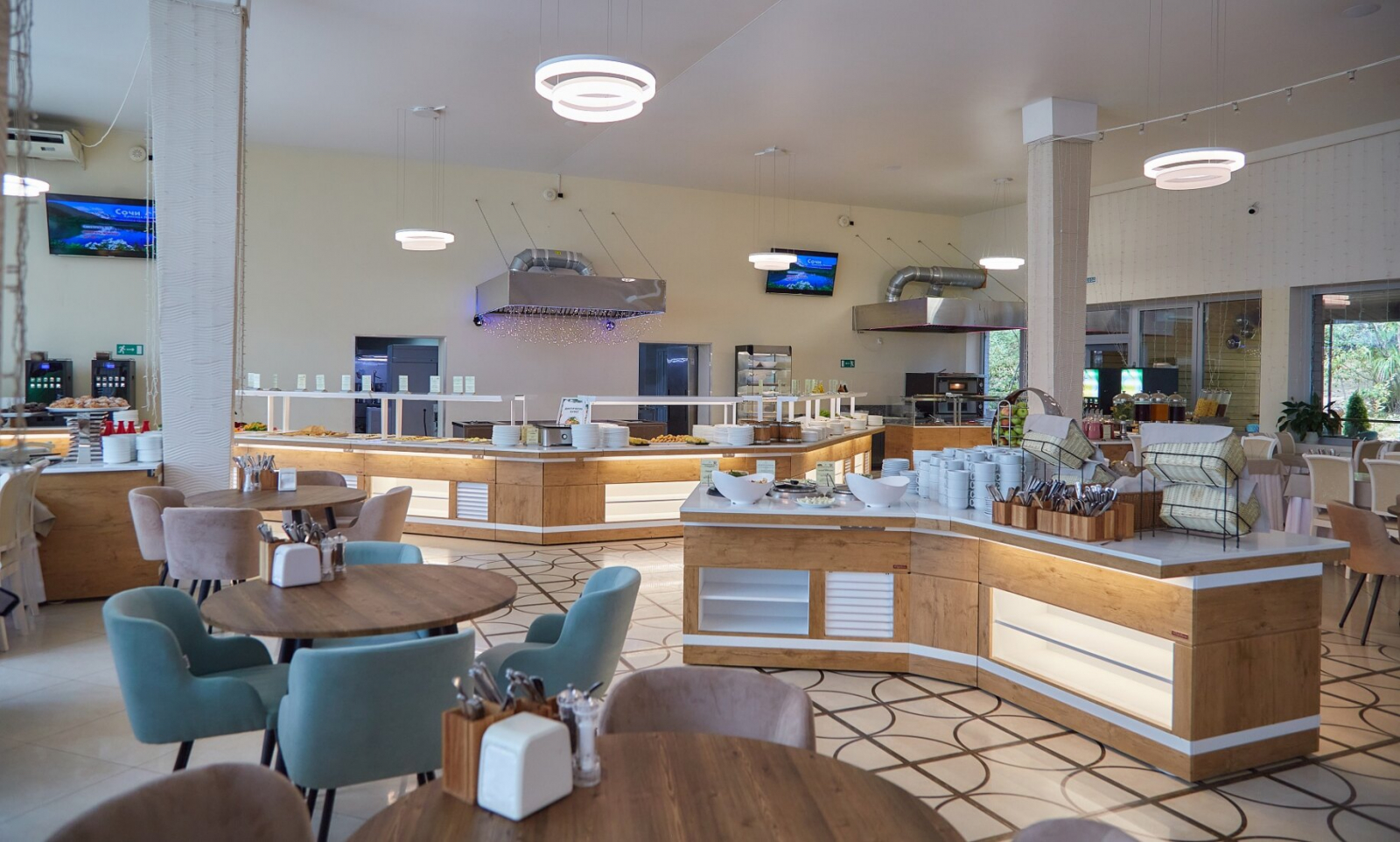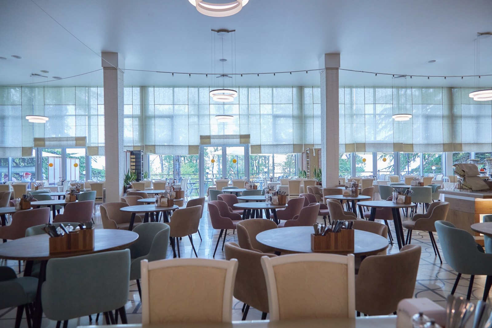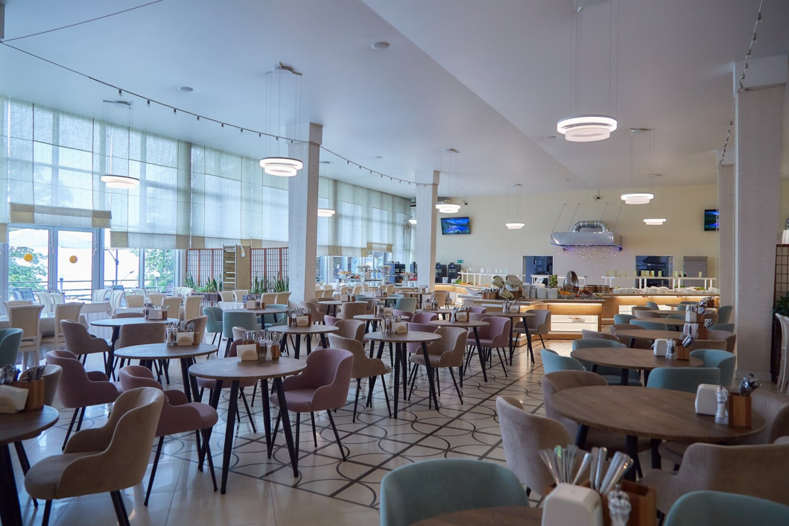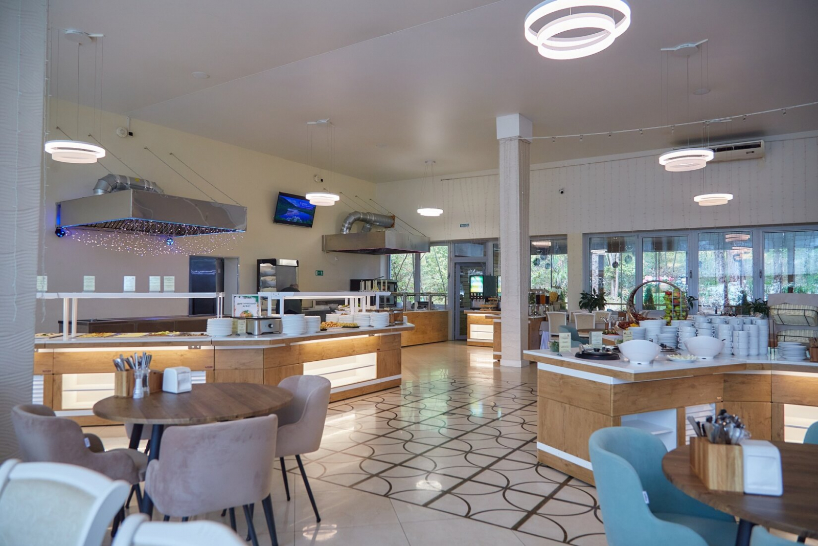 Завтраки, обеды и ужины проходят в ресторане по системе «шведский стол». Из его окон открываются потрясающие морские пейзажи. В меню есть большой выбор блюд русской, кавказской и европейской кухни. Сладкоежки оценят обилие десертов, ароматной выпечки, пирожных и печенья.